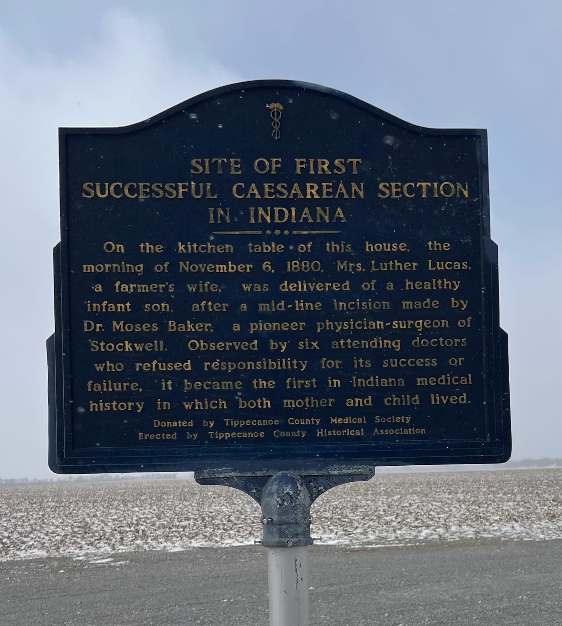 The marker, titled "Site of First Successful Caesarean Section in Indiana," located along U.S. 52 south of Lafayette, reads thusly:
